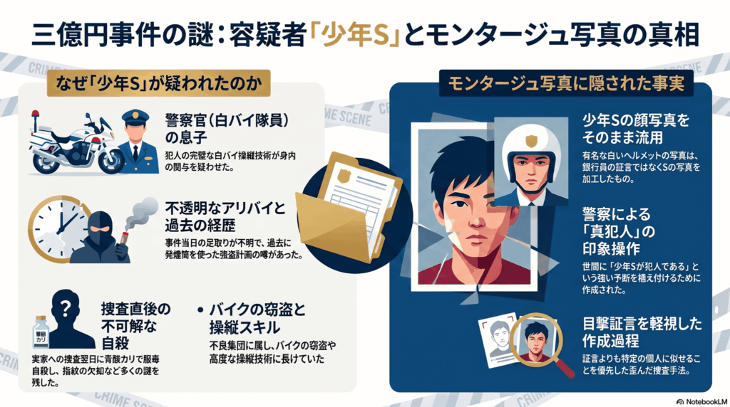 誰もが一度は見聞きしたことがある、あの白いヘルメットの犯人のモンタージュ写真。実は、あれは銀行員の証言から作成されたものではないという衝撃的な事実があります。実際には、亡くなった少年Sの顔写真をほぼそのまま流用して作成されたものだったのです。