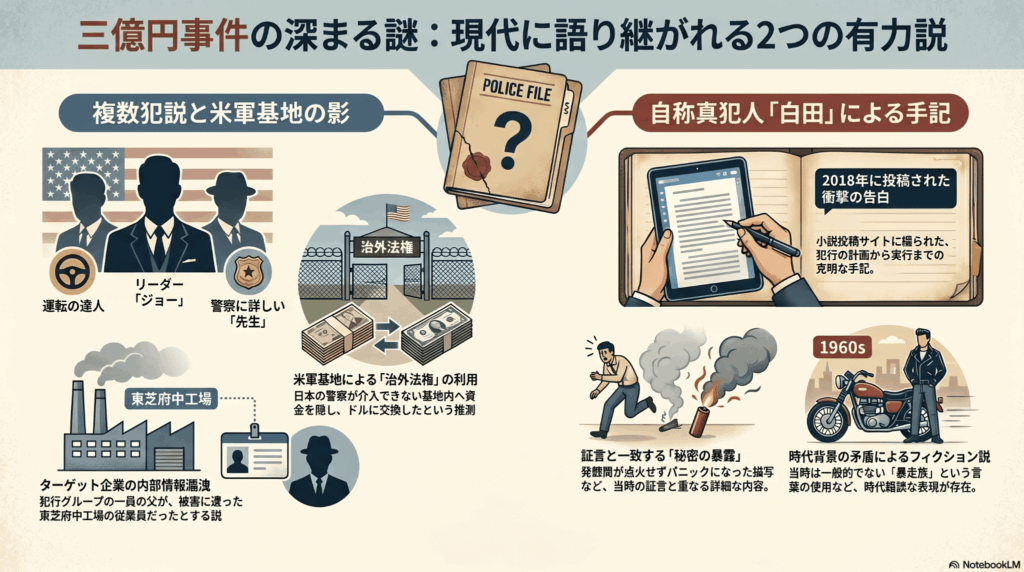近年、特に注目されているのが「ジョー」という人物を中心とした複数犯説です。彼はアメリカ兵と日本人の間に生まれ、立川グループのリーダー格だったと言われています。この説では、ジョーと、車両操縦の達人「ロク」、そして警察内部に詳しい「先生」と呼ばれる3人による共同犯罪だったとされています。